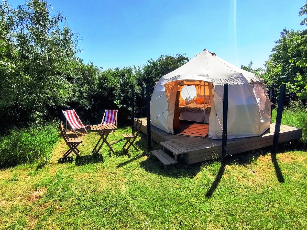 Ervaar het authentieke biologische boerenleven terwijl je verblijft in onze 28m ² luxe katoenen tenten vlak naast het vogelreservaat Ølene. Kom in contact met vrienden, familie of je partner onder de sterren en kom dicht in de buurt van de natuur. Luister naar het geluid van de zomer geleverd door de skylark van je hangmat. Bereid onze biologische en biodynamische producten op je gasgrill en pak iets kouds om uit je koelkast te drinken. Maak een wandeling naar de nabijgelegen vogeltorens. OPMERKING: de maximale capaciteit is 4 volwassenen (plus een kind)