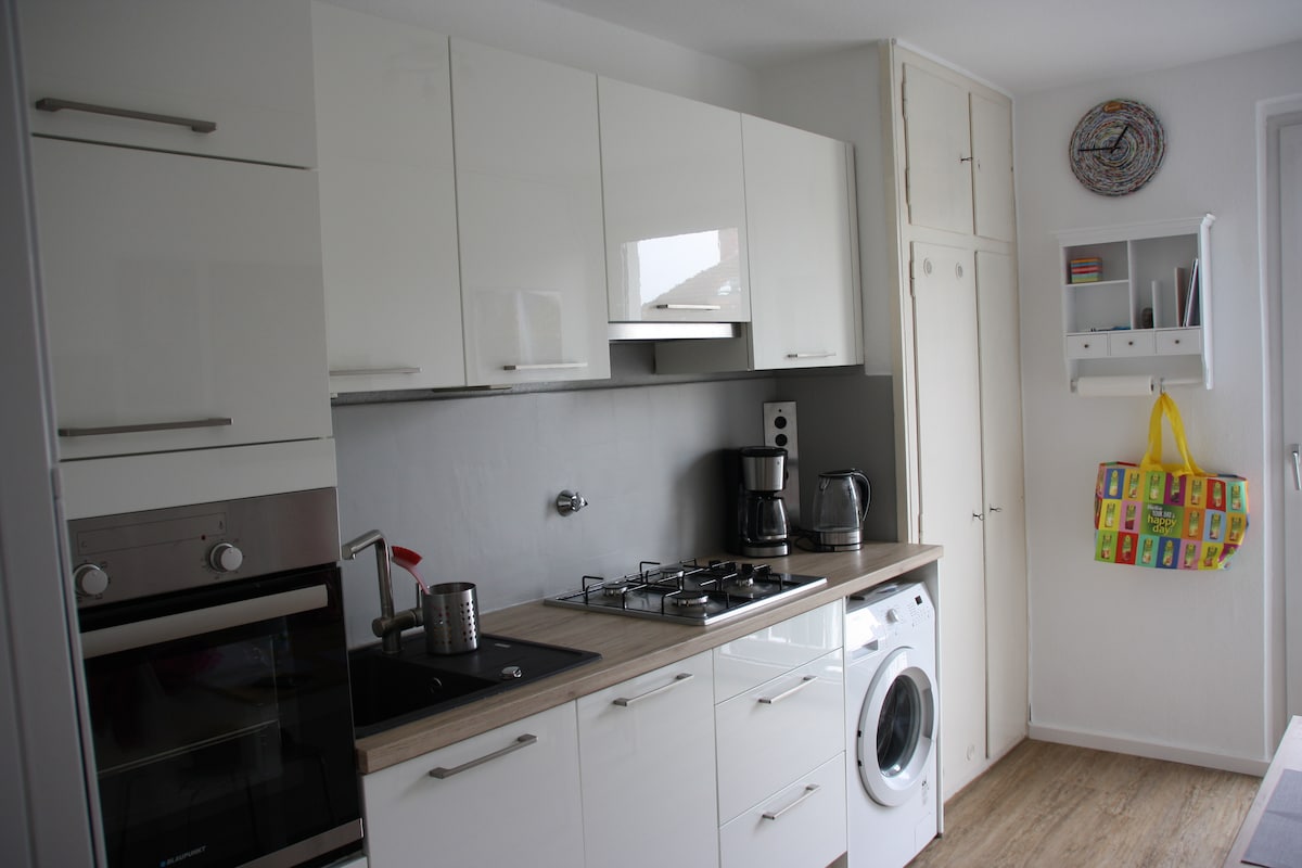 Gemütlich, lichtdurchflutete und stylisch neu eingerichtete Wohnung: Modernes Schlafzimmer +1 Schlafzimmer mit hochwertigem Boxspringbett & Smart TV Wohnzimmer + Gemütliche Sitzmöglichkeiten und TV Voll ausgestattete Küche + Mit gemütlicher Essecke mit 4 Stühlen + Öl, Kaffee, Tee, Salz, Pfeffer, Modernes Bad + Mit Dusche, Toilette und Waschtisch und 2 Fenster Unterwegs + Parkplatz und Fahrräder stehen kostenlos zur Verfügung + Zentrum schnell erreichbar mit dem Fahrrad, Auto und Bus.