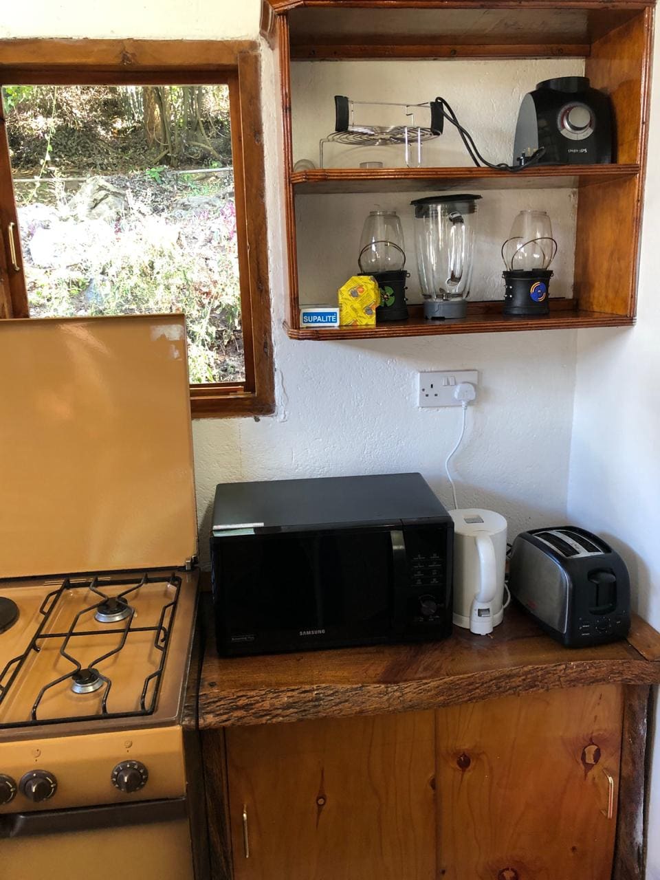 De Romantische Honeymoon Hut is Rustiek-Luxe op zijn best! Een volledig ingericht huisje met volledige keuken en de benodigde apparatuur voor zelfcatering. Voel de rustige stilte en laat zorgen en spanning los. Kijk naar de Malewa-rivier beneden en de uitgestrekte lucht erboven vanaf de prachtige veranda die direct naar beneden kijkt op de rivier. Geniet van een prachtige ervaring met een hemelbed met een geheimzinnige spiegel, een jacuzzi en een intieme open haard!