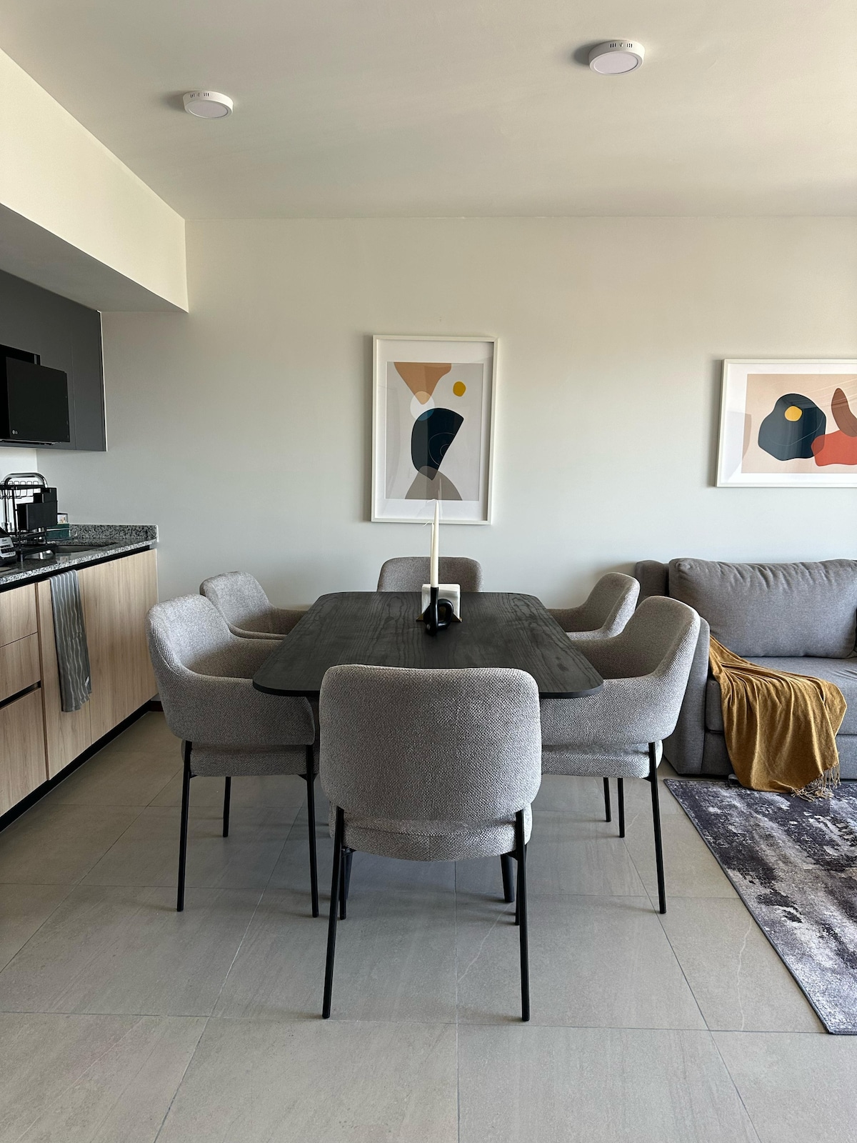 Enjoy the convenience of staying close to the historical center (5-10 min car drive) at Guadalajara's new complex "Acervo Central Living". Apartment with excelelent location to shorten the journeys to the most important points of interest. Use the amenities: roof garden, coworking, central patio, lobby, kids zone, underground parking for 1 car and bikes, elevator. Discounts for weekly and monthly stays available.