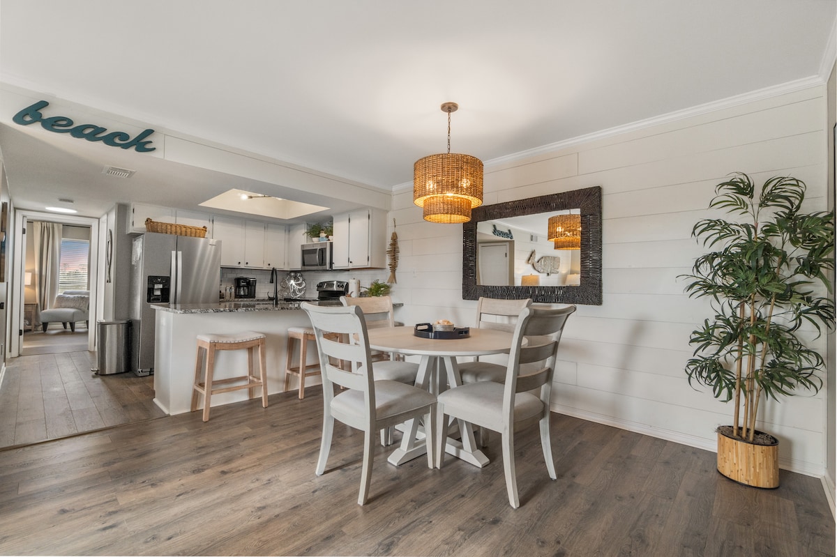 Aan de overkant van het strand! Ingericht met lichte kleuren voor een strakke, moderne uitstraling. Nieuwe vloeren, kanaalreiniging en REME HALO®-luchtreiniger voor het hele appartement in januari 2026. Geweldige locatie voor familie of twee stellen. Op loopafstand van restaurants. Er zijn strandstoelen, zandspeelgoed en boogieboards aanwezig. Overdekte parkeergelegenheid. Roestvrijstalen kookgerei en crockpot, zodat je maaltijden kunt bereiden voor een heel gezin. Wij leveren zeep, shampoo, conditioner, make-up remover doekjes voor jouw gemak.