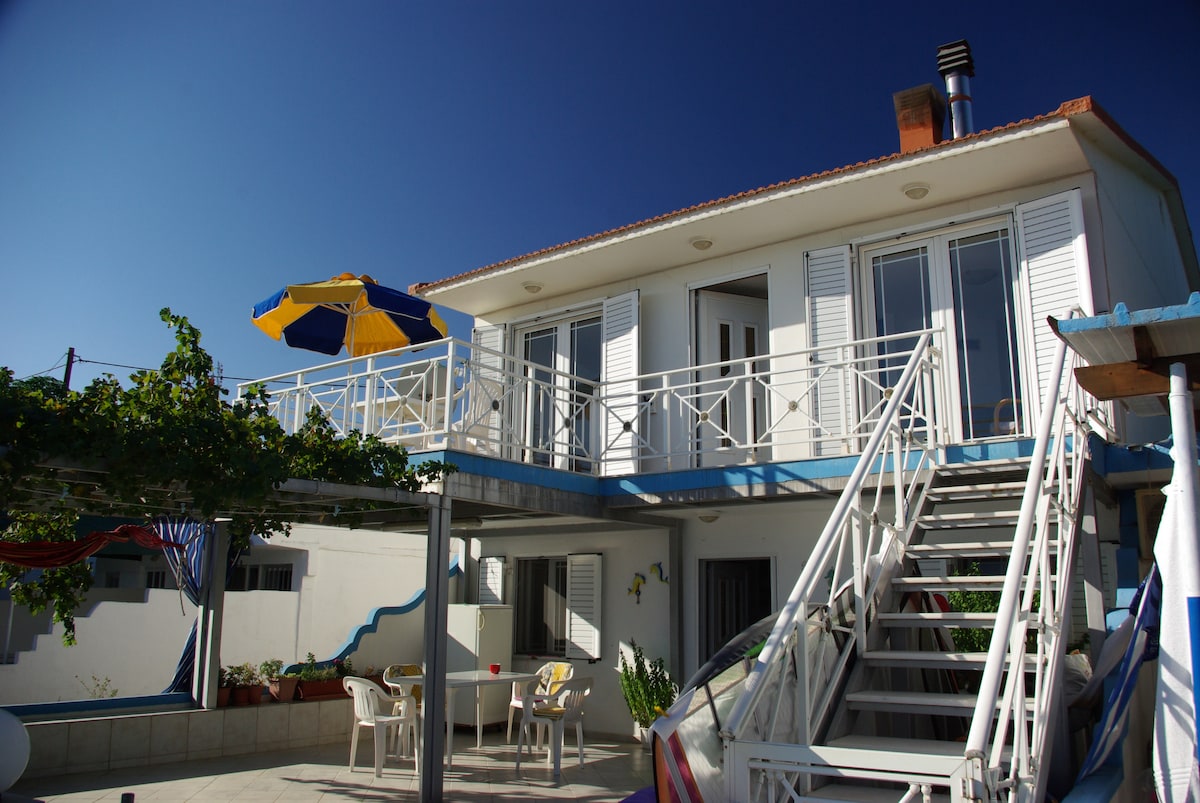 Prachtig uitzicht met een grote binnenplaats voor het huis, de zee ligt op ongeveer 5 meter afstand. De binnenruimte is 90 m ² en de omgeving is rustig. De begane grond van het huis is voorzien van keuken , badkamer en woonkamer met slaapbank . De eerste verdieping heeft een grote slaapkamer met een groot bed voor twee personen en een tweede slaapkamer met twee eenpersoonsbedden. Ook is er een klein toilet.