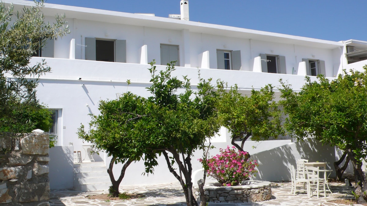 A brand new quiet and cool apartment in a beautiful relaxing yard in the heart of Naxos town is the best choice for your vacation. A short walk from the port, the commercial center of the town and the nearest beach. Nearby there are supermarkets, gyms, bus station, taxi rank, cafe, bars and restaurants