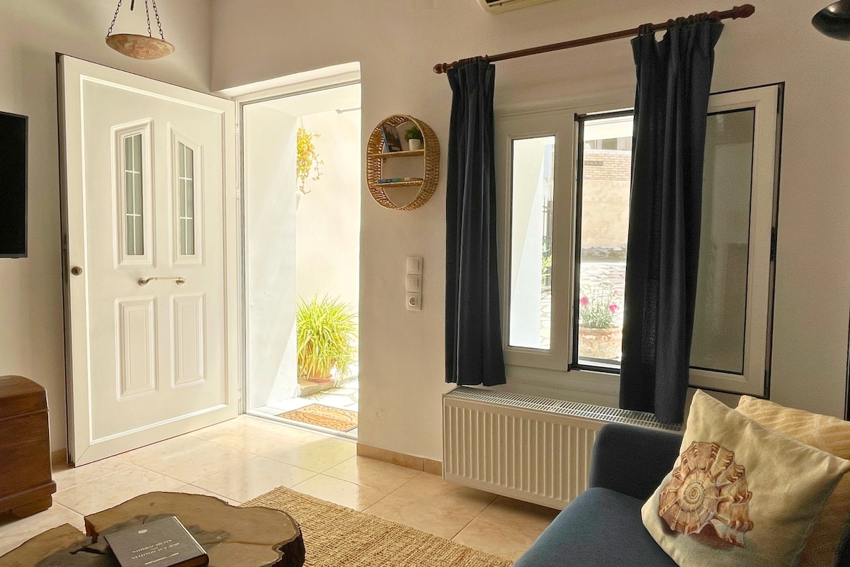 Ons appartement ligt aan de rand van het dorp Agioi Douloi, in een rustige, vredige buurt. Het beslaat twee verdiepingen en maakt deel uit van een twee-eeuws familielandgoed op een terrein van 6 hectare met een kleine moestuin en eeuwenoude olijfbomen die generaties lang zijn doorgegeven. De tuin in mediterrane stijl beschikt over rozemarijn, bananenplanten, bloemen, druiven, een vijgenboom en natuurlijk de iconische oude olijfbomen van het landgoed.