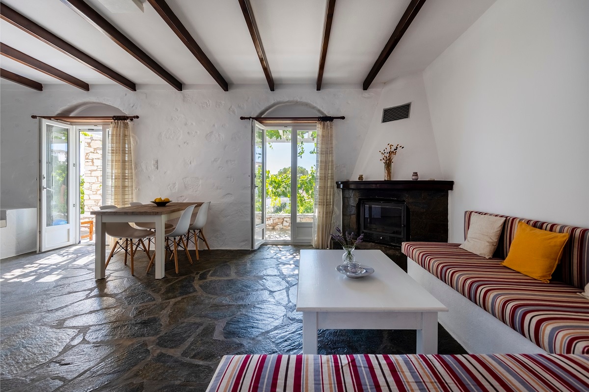 Ons traditionele Cycladische stenen huis (65 m ²) ligt in het centrum van het dorp en heeft een prachtige tuin met citroen, sinaasappel, granaatappel, abrikoos, avocado en druivenbomen, waar u kunt ontspannen en genieten van de natuur. Het appartement heeft een panoramisch uitzicht op het dorp en een adembenemend uitzicht op het eiland Naxos. Het huis is milieuvriendelijk,geschikt voor werk en heeft zonne-energie. Wifi is ook betrouwbaar voor werk. We accepteren langere verblijven. Alles wat je nodig hebt is 20 meter te voet.