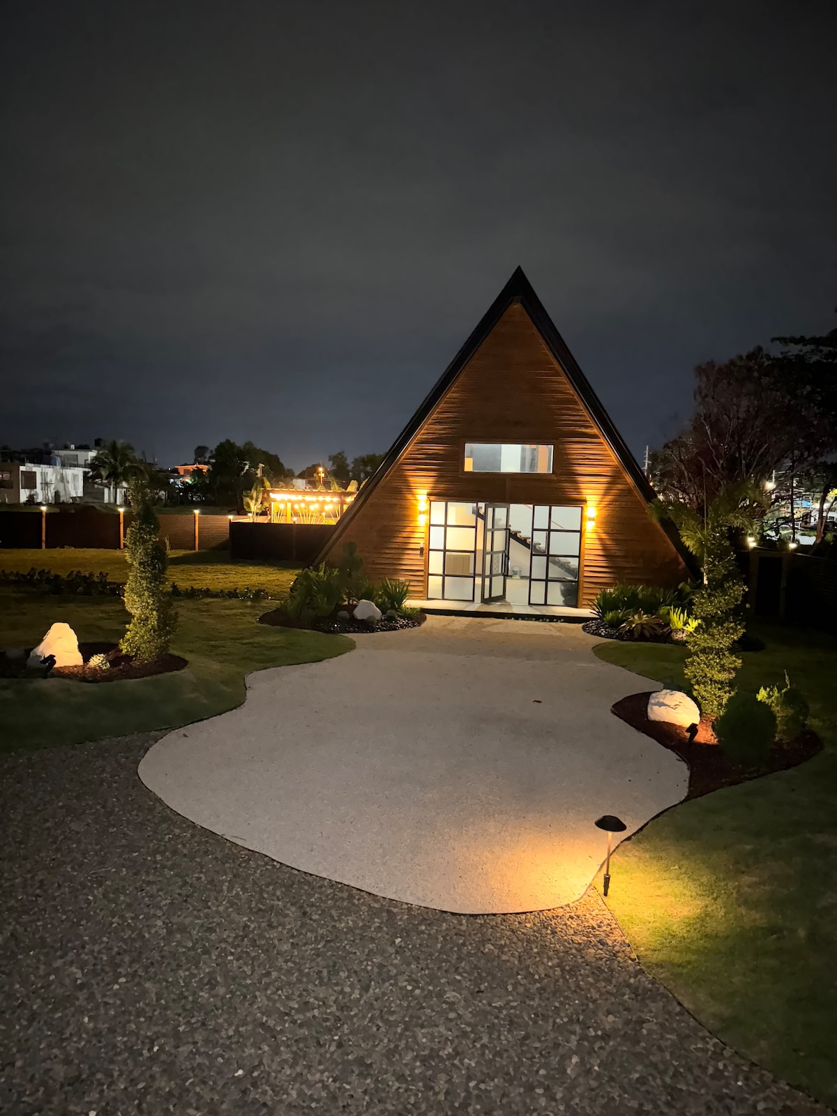 Accommodatietype:** Driehoekige hut - **Locatie:** 6 minuten rijden van het strand, restaurants en supermarkt; 15 minuten van Rafael Hernández Airport. - **Faciliteiten:** - Privé - Zwembad voor twee (zonder verwarming) - BBQ (houtskool niet inbegrepen) - Klein elektrisch fornuis - Appartementskoelkast - Bestek, pan en pan - Warm water in de douche - Generator en stortbak - **Keuken:** Buitenkant - **Badkamer:** Interieur van de hut - **Parkeren:** In de patio