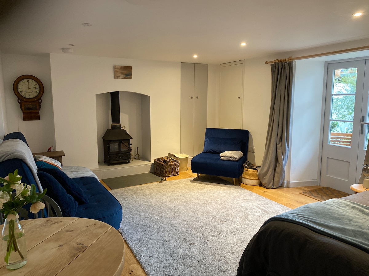 Welcome to Primrose Studio, a self-contained apartment on a quiet, private drive - just 2 mins walk to the centre of Totnes. Satnav won’t find us - our check in directions will ! Beautifully converted in 2021 - with slate/wooden floors with underfloor heating, wood-burning stove, bathroom with roll-top bath and walk-in shower, and a separate fully-equipped galley-kitchen. The studio has its own front door, with its own parking space right outside. Ideal for couples, we welcome family pets too.