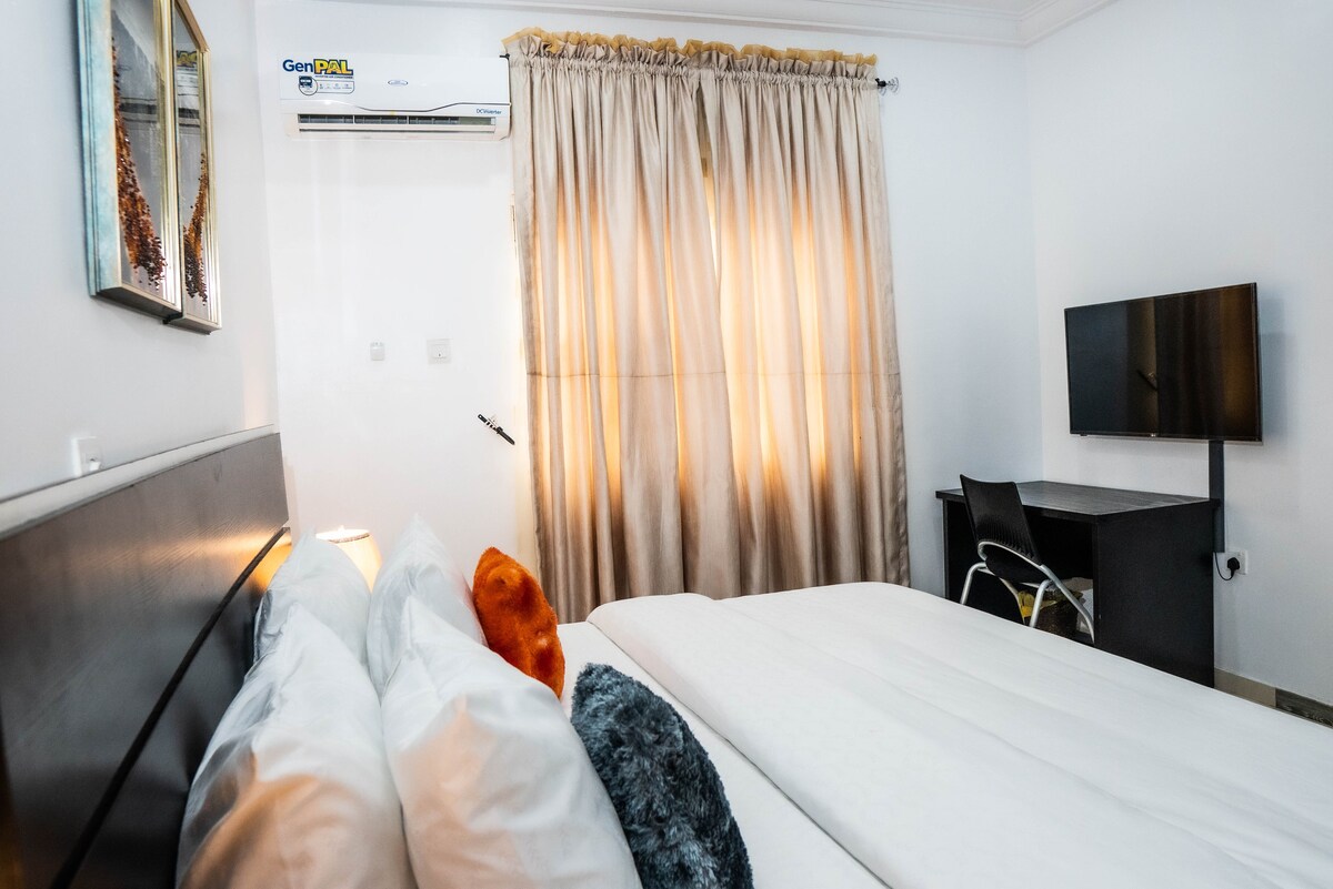 Geniet van een modern appartement met 3 slaapkamers met alles wat je nodig hebt voor een comfortabel verblijf. Deze ruime woning beschikt over wifi, 24/7 elektriciteit, schoon stromend water en vier eigen toiletten, en biedt gemak en privacy voor groepen of gezinnen. Gelegen in een uitstekende, gemakkelijk toegankelijke buurt, kun je genieten van snelle toegang tot restaurants, winkels en belangrijke bezienswaardigheden in de stad. waardoor het perfect is voor zowel korte als lange verblijven.