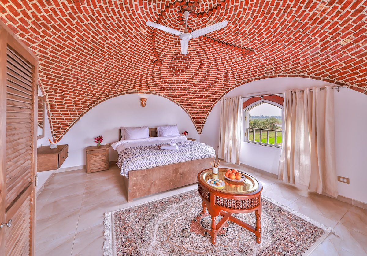Een heerlijke ruimte met twee verdiepingen met interne trap, koepel slaapkamer op de 2e verdieping, eigen dakterras met een spectaculair uitzicht op de bergen, met de vallei van de koninginnen recht vooruit, een super rustige locatie in traditionele boerderijen, maar 7 minuten lopen naar Medinat Habu de dichtstbijzijnde tempel, zodat je kunt genieten van de rustige magie van Luxor na een drukke dag een bezoek aan de tempels. Een plek om gewoon te zijn.