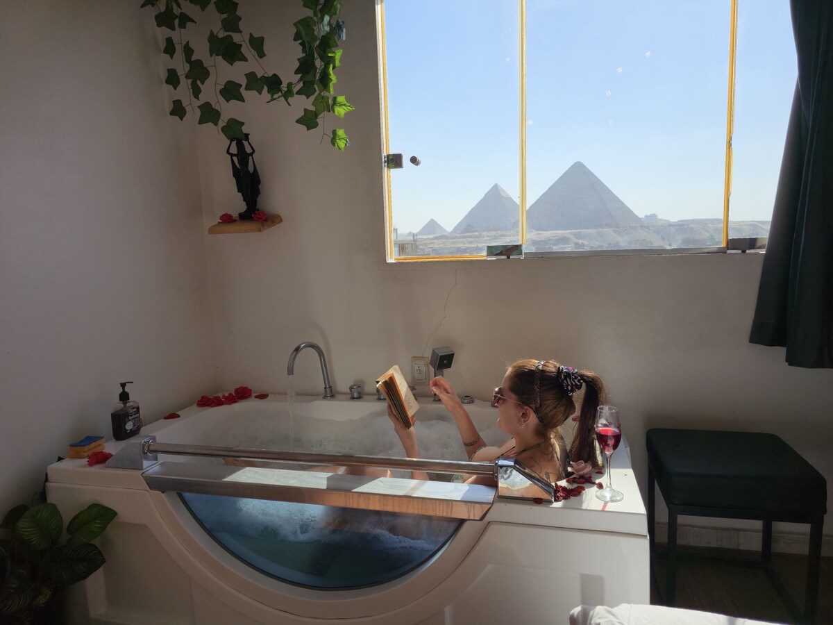 Welcome to your private rooftop retreat in the heart of Giza! This charming studio sits on a spacious rooftop, offering breathtaking views of the Pyramids—perfect for sunrise coffee, sunset lounging in the hammock, or soaking in your very own jacuzzi under the stars. A fully equipped kitchen Comfortable sleeping and relaxation area Private entrance for your peace and privacy Whether you're here for adventure or relaxation, this studio offers the perfect mix of comfort, and unforgettable view.