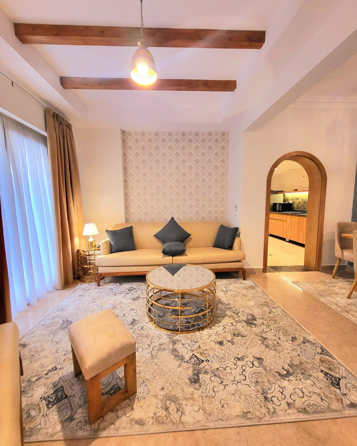 Verblijf in een chique appartement met 3 slaapkamers in het hart van New Cairo, op steenworp afstand van de beste winkelcentra en attracties. De woning beschikt over een kingsize slaapkamer, een queensize slaapkamer en een slaapkamer met twee eenpersoonsbedden, allemaal met airconditioning. Ontspan in de ruime woonkamer met een 60” smart-tv, geniet van snelle wifi of ontspan op het balkon. Een volledig uitgeruste keuken, moderne badkamers, warm water en slimme toegang tot het slot zorgen voor een comfortabel verblijf voor gezinnen, vrienden of zakenreizigers.