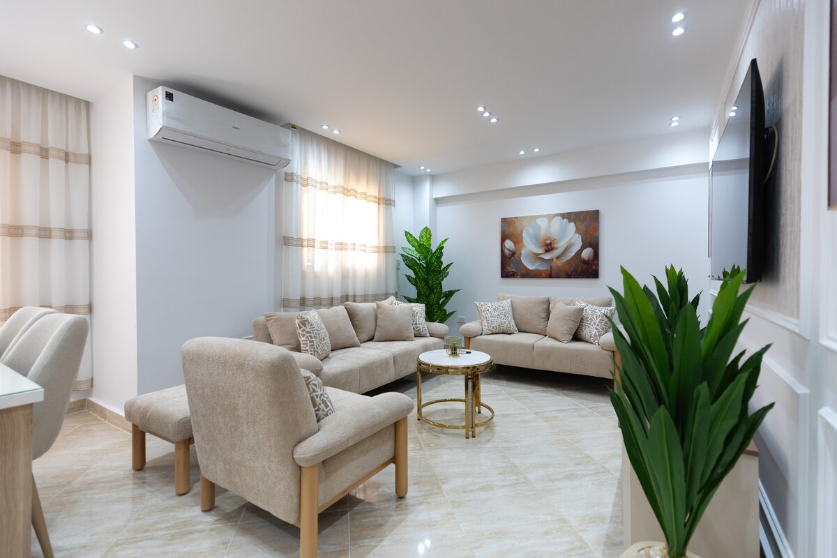 Luxe-appartement 🏡 in Transit Ruim appartement volledig ingericht met moderne meubels. Het heeft twee slaapkamers met comfortabele hotelbedden, een moderne lounge met smart-tv en wifi en een volledig uitgeruste keuken. Luxe 🛁 badkamer met zeep, shampoo en gratis gratis douchegel voor alle gasten. Gelegen op de derde verdieping (geen lift), op een toplocatie in een recreatiegebied, in de buurt van Carrefour Obour en de luchthaven. Uitgelichte ✅ services: • Airconditioners • gratis schoonmaak voor langere verblijven • Automatische verlichting in geval van stroomuitval • De mogelijkheid om op verzoek een privévervoermiddel te verstrekken Ideaal voor gezinnen en jongeren, en beter dan luxe hotels ✨