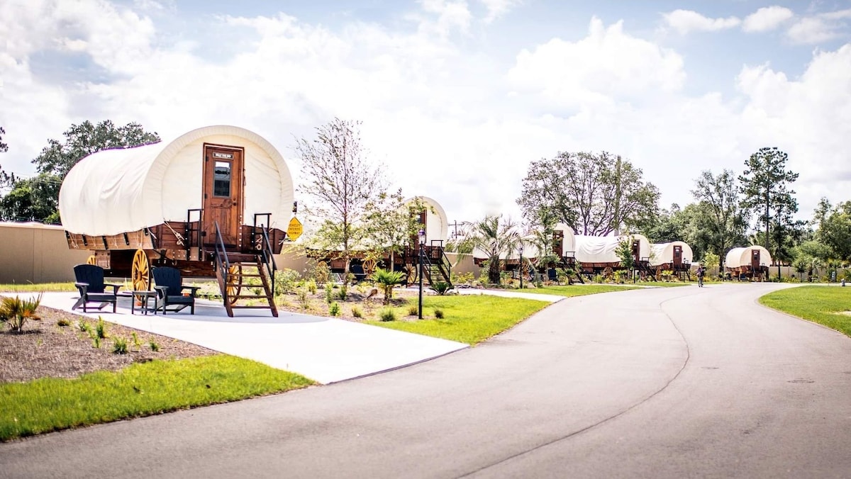 Gezinsglamping met een historische uitstraling in een echt overdekt Wagon Resort. Het is een unieke ervaring die moderne voorzieningen biedt met een luxe uitstraling. Slechts 58 mijl naar de beroemde St Augustine en 25 mijl naar Gainesville. Het resort biedt tal van voorzieningen die je bezig houden of je kunt gewoon ontspannen. Onze voorouders verbleven nooit in een wagen als deze, compleet met elektriciteit, een complete badkamer met wastafel en douche, en verwarming en airconditioning. De kinderen zullen het prachtig vinden! Ook in 2 queensize bedden !