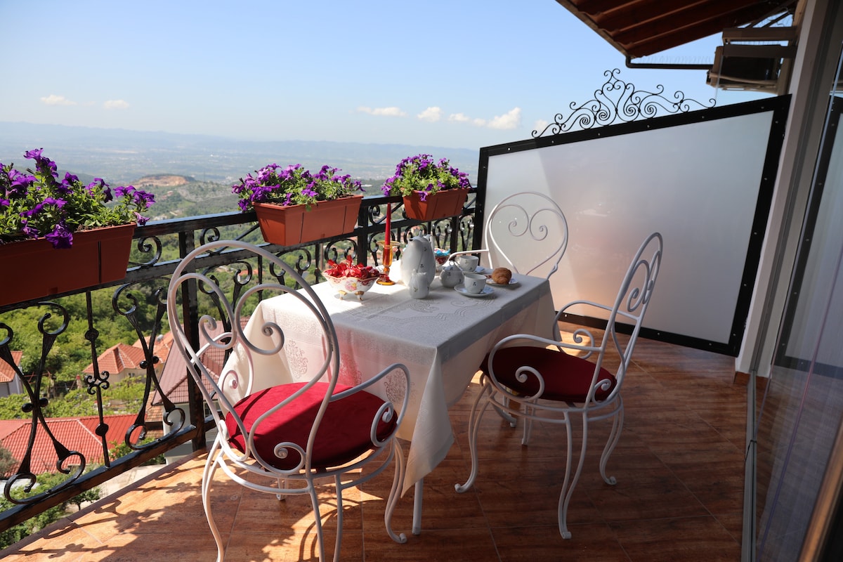 Geniet van je verblijf in deze gezellige, onlangs gerenoveerde privékamer met eigen badkamer en een prachtig uitzicht op de bergen en de stad als Gjirokastra. Deze kamer is gelegen in een huis dat 3 andere privékamers heeft voor gasten die een gemeenschappelijke overdekte eethoek delen en ook een gedeelde buitenpatio om op een zonnige dag te ontbijten en te genieten van je avond bij de vuurplaats. De patio is de plek om te ontspannen en tot rust te komen na een wandeling door het oude centrum van Gjirokastra.