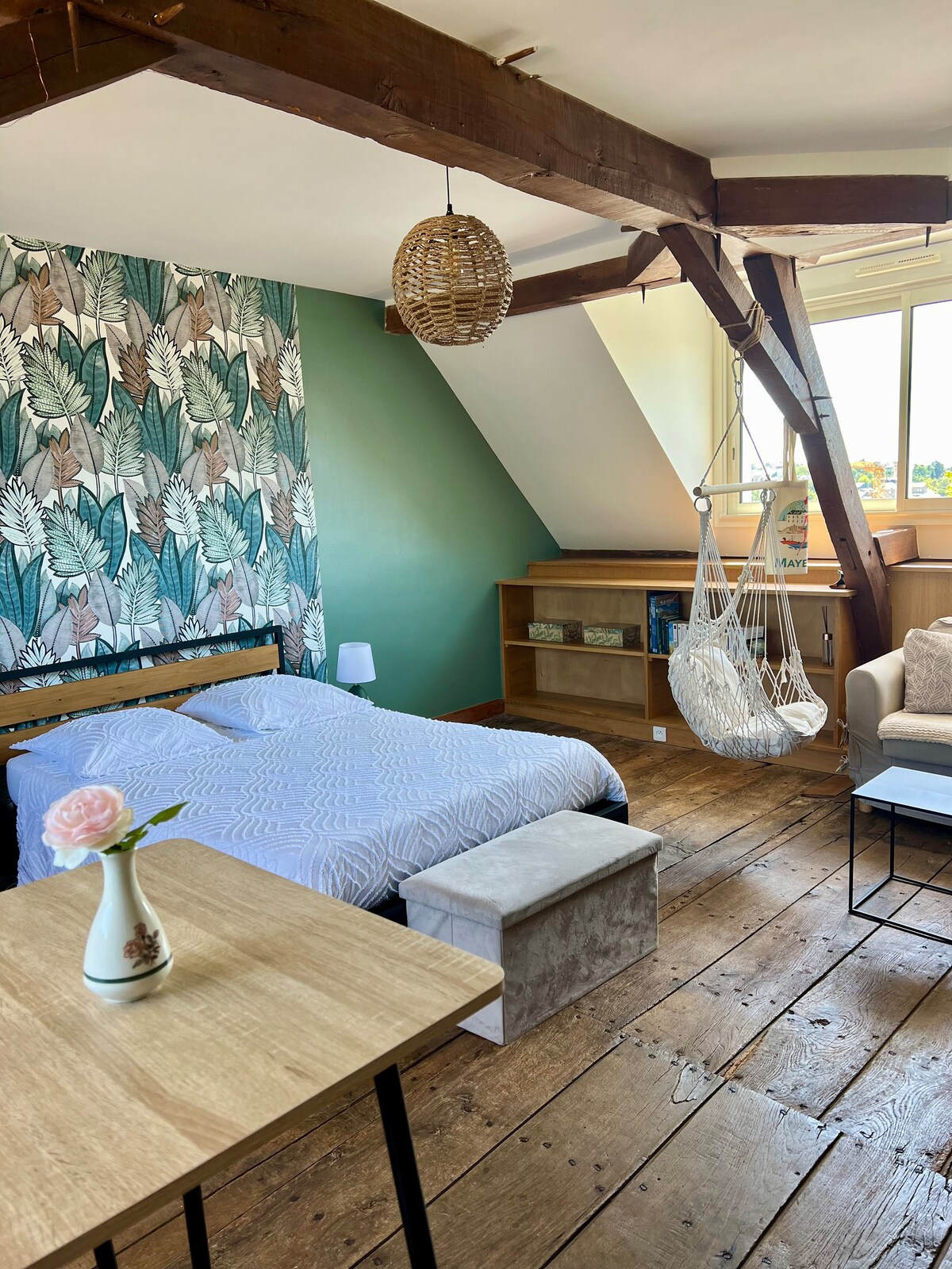Je bent van harte welkom in mijn appartement, we wonen hiernaast . Ik heb het met veel plezier gedecoreerd en ingericht. Ik hoop dat je je er goed bij voelt. Ik wilde het gastvrij, licht en comfortabel maken Het heeft twee nadelen: de toegang is via een smalle wenteltrap, dus niet altijd gemakkelijk met grote koffers. Ondanks de isolatie kan het in de zomer warm zijn omdat het onder de zolder is.