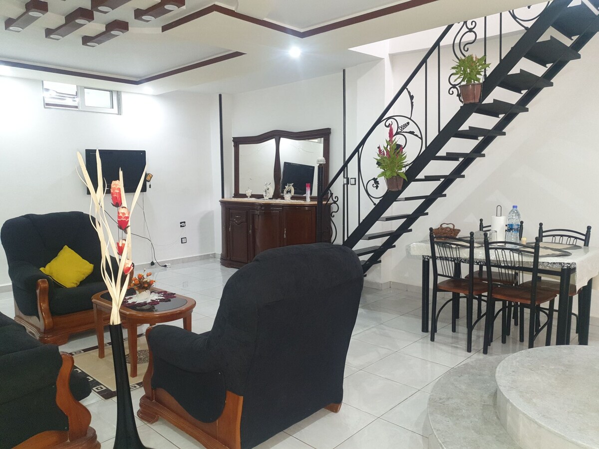 Groot appartement op de eerste verdieping. Modern, comfortabel voor uitstekende verblijven (airconditioning, wifi, tv...) drie slaapkamers, een woonkamer en open keuken, badkamer en toilet. Het is de ideale plek voor een gezin, toeristen of zakenreizigers. Het is een rustige en vredige hoek. 5 minuten van de snelweg. 20 minuten van de luchthaven en de haven van Algiers. In het hart van de wilaya van Algiers. Het appartement ligt op Tixeraine, ondersteund door het amusement en het zoölogische park. 1 parkeerplaats in een garage