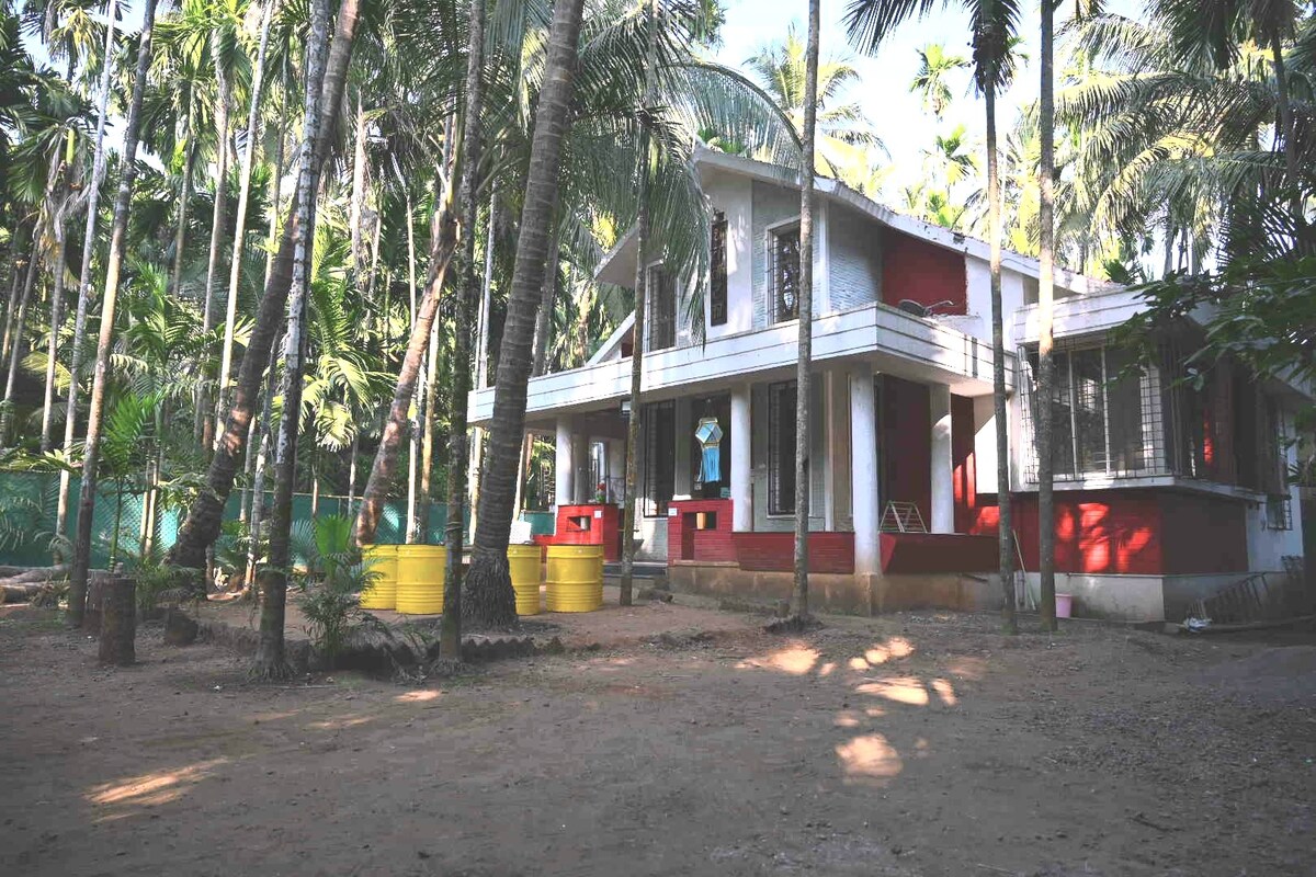 Gelegen in het midden van een 2 hectare grote kokosnootboomgaard, is een bungalow met 3 slaapkamers, gebaseerd op het ontwerp van de architect Charles Correa. 1 uur rijden/veerboot van Mumbai. Onze gasten zijn losgekoppeld van de stad en aansluiten op de natuur - de golven, vogels, wuivende palmbomen en gouden zonsondergangen. Gerund door Rohan & Jharna, die naar hun 80 jaar oude biologische boerderij zijn verhuisd voor zijn rust en privacy, laten zien hoe het mogelijk is om duurzaam van het land te leven en je uit te nodigen om een gelijkwaardige deelnemer te zijn. Waarom wachten?! Boek snel een kamer of alle drie!