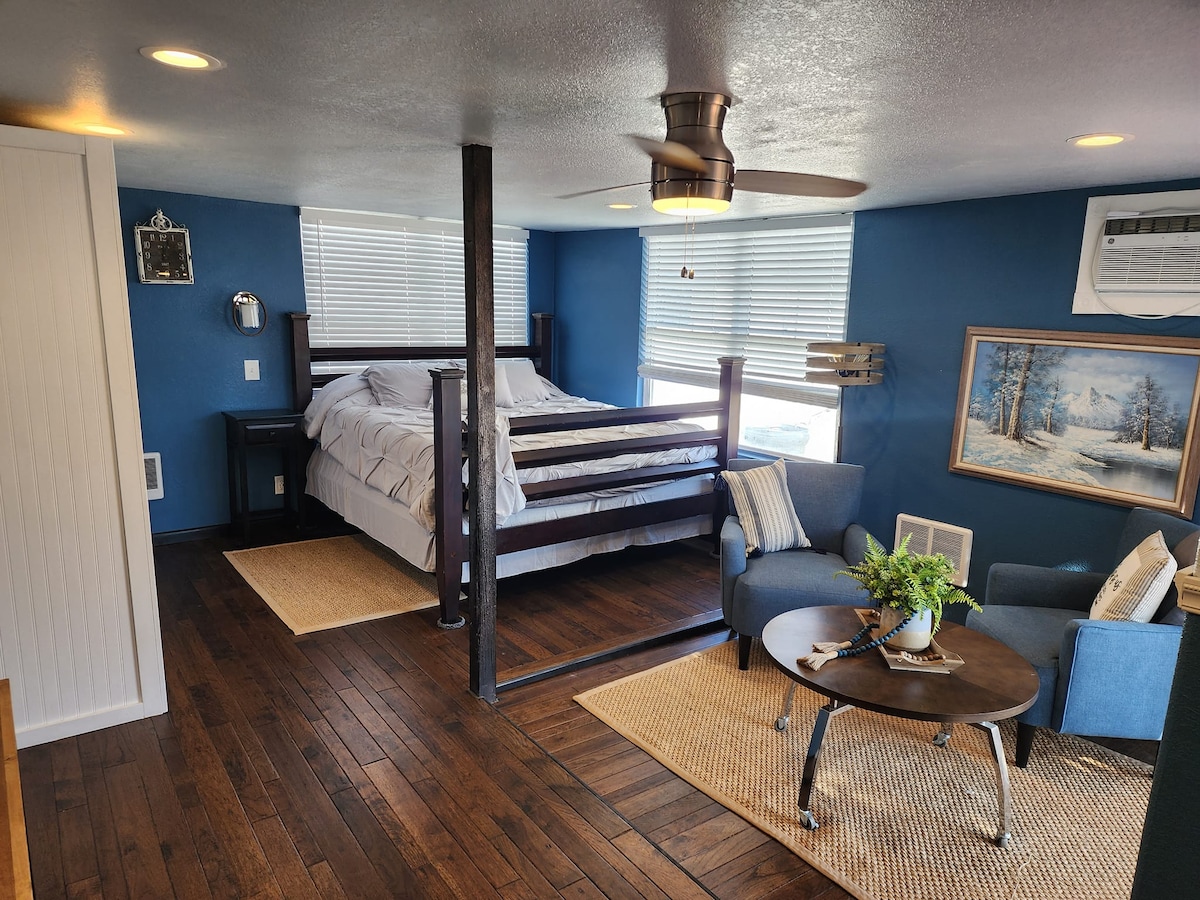 Two bedrooms, one bathroom, and a fun vintage style living space & kitchen. Full dining room and coffee bar, vintage work desk, smart tv, Alexa, with full laundry facilities in the basement. This AirBB is pet friendly with a small pet-guest fee. Keep it simple at this peaceful and centrally-located place. Small town charm with the peace and quiet that lets you rest and relax. This is a non-smoking unit. Smoking is allowed outside, but please throw cigarette butts in the alley trash can.