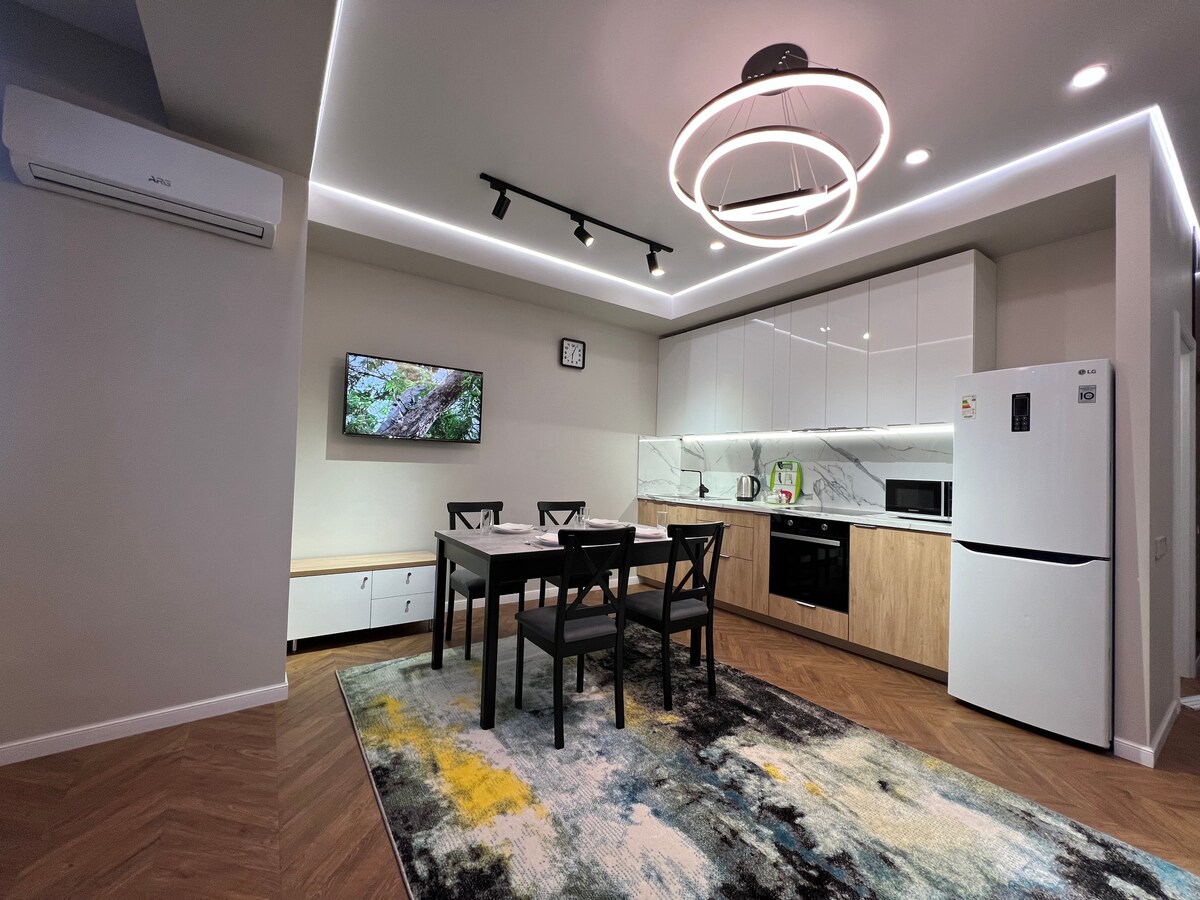 Светлые апартаменты бизнес-класса в центре Алматы — Meridian Apartments Элегантные и уютные апартаменты с современным интерьером, оформленные в нейтральных пастельных тонах. Рабочее место оборудовано стильным деревянным cтолом, удобным креслом, идеально подходит для деловых поездок или удалённой работы. Апартаменты оснащены телевизором с плоским экраном, бесплатным Wi-Fi и полностью оборудованной кухней. Каждый элемент интерьера продуман до мелочей — для вашего максимального комфорта и уюта.