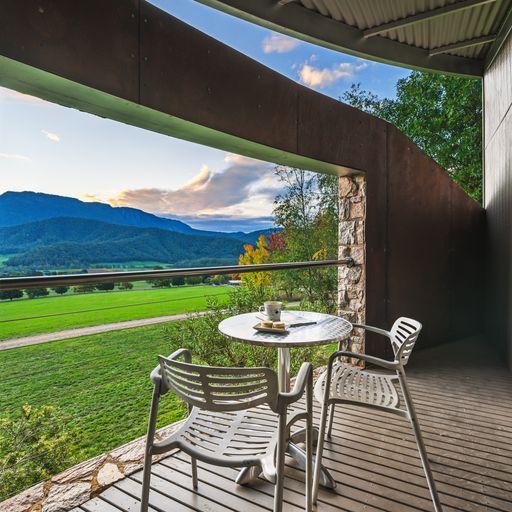 Entering the main area you are surrounded by glass walls with breathtaking views all around you. The main view looks straight up the Ovens Valley and up to Mt. Bogong. Stepping through the sliding door onto the balcony you can enjoy outdoor dining or time on our outdoor lounge seating, both of course have stunning views. Embrace the relaxed feel on our lounge, by the gas log fire provide warmth in the cooler months.