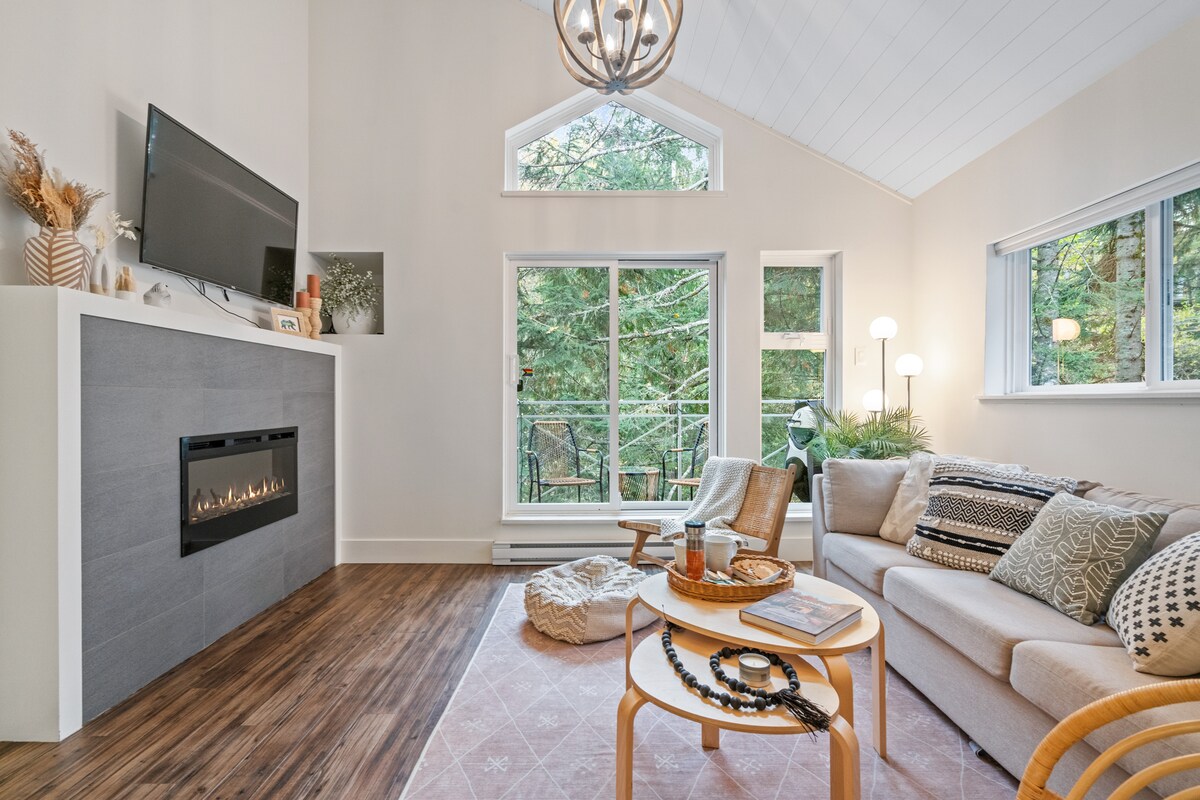 Moderne Scandi 1 bd in rustige Creekside. 3 minuten lopen naar Gondola. Grenzend aan de Valley Trail. Verwarmde vloeren, regendouche, 50 inch smart-tv, snelle wifi, open haard, eigen skirek en GRATIS parkeergelegenheid. Creekside Village aan de overkant van de straat voor fietsverhuur, boodschappen, fitnessruimte...Kies uit lekker eten (Rimrock, Red Door, Mekong), comfortfood (South Side, Creekbread), pubs (Roland's, Dusty's) en cafés (BReD, Rockit). 7 minuten rijden/busrit naar Main Whistler Village. Openbaar vervoer ligt op twee minuten van de deur.