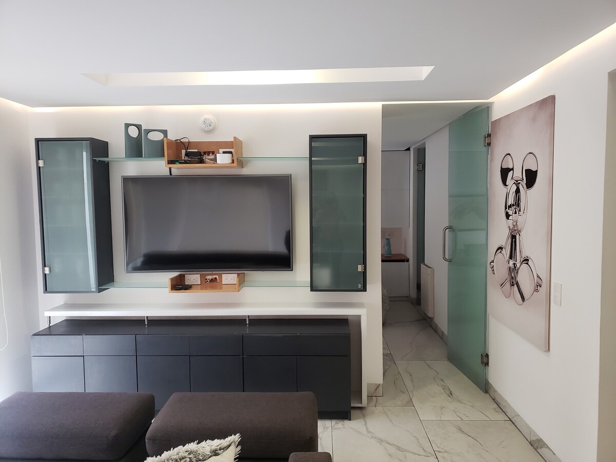 Geniet van dit ruime en mooie appartement, zeer licht en met plafonds met dubbele hoogte. Ingericht met warme houten vloeren en geweldig Mexicaans meubilair. 5 sterren in netheid en verzorging. Met zelf-inchecken. Een ideale plek om te rusten en Mexico-Stad te ontdekken. Het ligt in de nieuwe DOMAIN TOWER, in een uitstekend gebied van de South City van Mexico-Stad. We hebben snelle wifi: meer dan 100 Mbps. Er is een moderne en goed uitgeruste fitnessruimte in het gebouw.