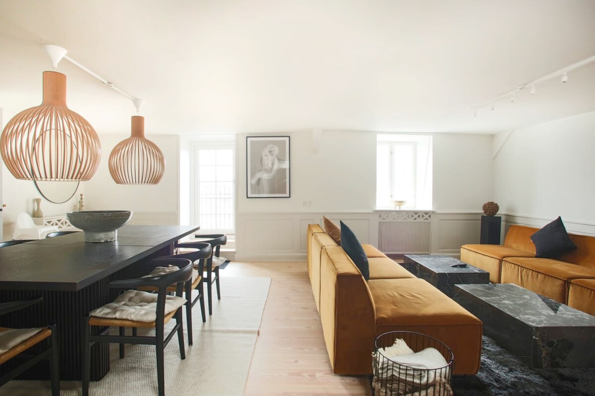 The 110sqm appartment has been fully renovated in a Nordic modern style and features heated Dinesen hardwood floors, Vola fixtures, an oak & granite kitchen and danish design furniture. The most stunning aspect is the 50sqm private rooftop with a heated bathtub overlooking Copenhagens skyline.