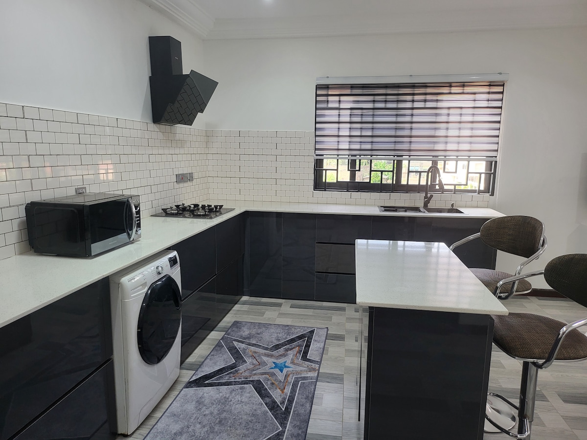 Kom en verblijf in dit nieuwe appartement en geniet van comfort, veiligheid, gemakkelijke toegang tot supermarkten, levensmiddelen, boiler in de wasruimte en nog veel meer. 10 minuten naar China Mall 15 minuten naar Achimota Mall 10 minuten naar Amasaman Melcom 45 minuten naar de luchthaven Gemakkelijk toegang tot UBER en BOLT. Restaurant beschikbaar. Een toegewijde manager en een schoonmaker om je te helpen als je iets nodig hebt. Er wordt niets gedeeld! Ophalen, afzetten op de luchthaven en chauffeur beschikbaar voor je hele verblijf (zeer bespreekbaar en handig).