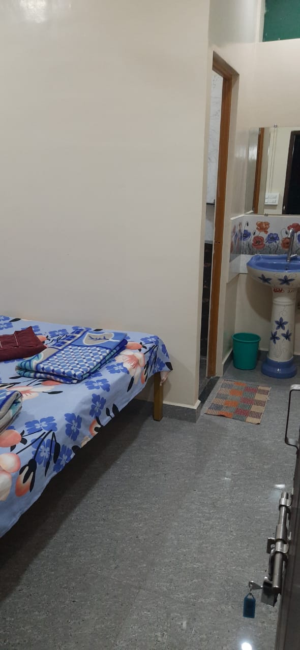 Simple, private, non-AC and comfortable room at Kamat Homes, suitable for up to 3 guests. Ideal for solo travelers, families, students, and backpackers seeking a peaceful, budget stay. The room includes a double bed with clean mattress, fresh bedsheet, pillows and blanket, good ventilation, window, side table, chair, and charging point. Private attached wash area with washbasin and bathing space. Quiet, clean, and homely atmosphere.