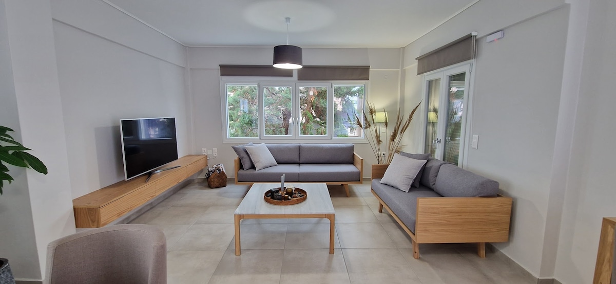 Luxe villa van 90 m ² met een enorme woonkamer van 60 m ² en een prachtig uitzicht op de Egeïsche Zee en het strand van Lygaria. Twee ruime slaapkamers met kingsize bedden uitgerust met een keramische matras en alle voorzieningen voor een diepe en ontspannen slaap. Dompel jezelf onder in de gezellige bank in de lounge, geniet van een film bij Netlix of bereid een diner in de open moderne keuken met alle benodigde apparatuur of bereid een romantisch diner buiten onder de prachtige zonsondergang.