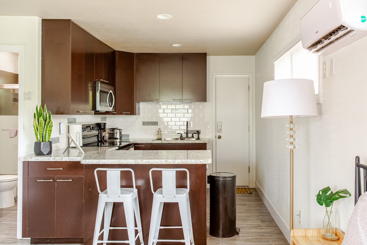 Kick back and relax in this calm and stylish space! Recently renovated, our modern guest suite will feel like your home away from home! Start your day right making a morning cup of coffee in the cozy coffee nook. Enjoy cooking up an afternoon lunch in our fully stocked kitchenette with a microwave, electric stovetop, full fridge, and cookware. Situated close to shops, grocery stores, restaurants, and bakeries, right off highway 5 and 3-5 min from the Civic center and the downtown area