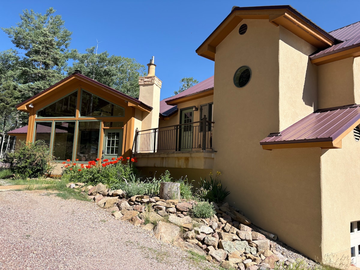 Angel Fire Resort ligt op een halve mijl afstand. Nieuwe lift aan de achterkant en nieuwe sneeuwproductie-apparatuur voor dit jaar! Maximaal 10 van je vrienden/familie zullen genieten van een ontspannen bezoek op onze weide met geweldige Mountain View's en dagelijks bezoek van zwervende herten. Onze garage is beschikbaar voor één auto en opslag van je ski's en fietsen. Taos ligt op 24 mijl afstand met kunst, restaurants en winkels van wereldklasse. Red River ligt op 29 mijl.
