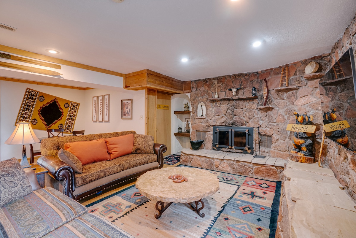 Perfect location for your Angel Fire vacation, the El Camino Real Lodge is steps away from ski/bike trail access and adjacent to the Oesta Vista greenbelt with trail access. This beautiful lodge comfortably sleeps 17 and features 4 bedrooms, 3 full baths, new 7-person hot tub, fire pit, 3 elevated decks, 5 smart TVs, and a bonus loft (4 twin beds) kids will love. With a rare fenced back yard and an easy access ramp entry (no steps), everyone is sure to enjoy their stay.