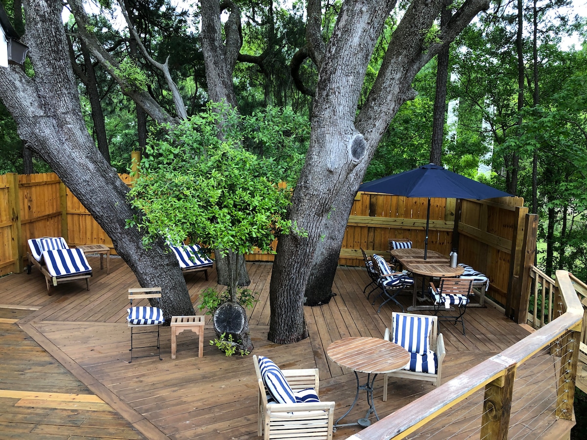 ONTSMET GRONDIG TUSSEN GASTEN DOOR! Luxe privésuite achter een historisch huis, het Cashmere Cottage is gelegen in het prachtige, live eiken gevulde Riverland Terrace - op minder dan 3 mijl van het centrum en op 8 mijl van Folly Beach. Je voelt je als royalty in deze gecondenseerde ruimte met luxe beddengoed, volledig VERSTELBAAR BED (!!), zachte handdoeken en badjassen, koffiebar met minikoelkast en enorme badkamer met een prachtige frameloze douche en producten van salonkwaliteit om jezelf te verwennen.