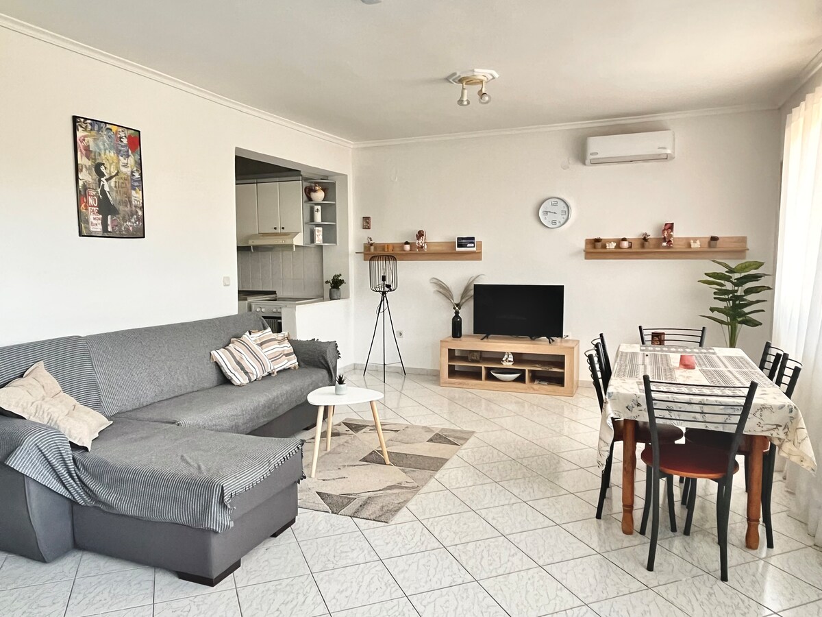 Ons unieke appartement is gelegen op de tweede verdieping van een dromerig huis in Epanomi. Het ligt op 3minutenrijden van het strand, in een rustige buurt. Geniet van het uitzicht op de Olympus-berg, de zee en de zonsondergang! Een super comfortabel bed, een gezellige slaapbank voor twee, een prachtig ontworpen ruimte met een jacuzzi, een enorm balkon, een geweldige tuin en barbecue, veilig parkeren, zijn enkele van de voorzieningen. Epanomi is zeer dicht bij de luchthaven Thessaliniki en Makedonia!