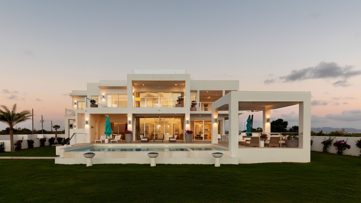 The green hills of St. Martin rise out of the blue depths of the sea in front of this boho-contemporary house on the shores of Anguilla. It was just refreshed, with a few nautical accents and new kitchen cabinets the color of the ocean, but its setting is timeless, with the waves crashing just beyond the outdoor living areas. A 5-minute drive and you’re on soft, sandy, bar-lined Rendezvous Beach. Start holiday mornings with a coffee from the Nespresso machine, sipped at the shaded sitting area on the verandah, or fresh fruit at the covered alfresco table. Soak in the Caribbean sun from a lounger by the pool and hot tub, then shift to a cooler spot in the shade of the outdoor wet bar. Linger outside under the stars or move indoors to a spot by the cable TV, Sonos sound system, and Wi-Fi. Clean-lined and low, the architecture of this vacation rental is a study in pared-down contemporary style. Inside, however, the whitewashed ceilings rise to surprising heights over a living room with cool stone floors and a comfortably slipcovered sofa, and a fully equipped kitchen whose stainless steel appliances could be in a restaurant but whose cabinets are painted the color of the sea. The villa’s setting on Pelican Bay means you’re just a 5-minute drive from Rendezvous Beach, one of the island’s best both for its powder-soft sand and turquoise water and the rum bars lining its shores—including one owned by a reggae star. Stop off at a bar or restaurant near Sandy Ground Beach, 10 minutes away by car, or bring the family to spot herons in the nearby pond. Copyright © Luxury Retreats. All rights reserved. BEDROOM & BATHROOM • Bedroom 1 - Primary: King size bed, Ensuite bathroom with stand-alone rain shower and bathtub, Alfresco shower, Dual vanity, Television, Safe, Air conditioning, Ceiling fan, Outdoor lounge area, Direct access to pool, Ocean view • Bedroom 2: King size bed, Ensuite bathroom with stand-alone alfresco rain shower, Dual vanity, Television, Safe, Air conditioning, Ceiling fan • Bedroom 3: 2 Twin size beds (can be converted to a king), Ensuite bathroom with stand-alone rain shower, Dual vanity, Television, Safe, Air conditioning, Ceiling fan • Bedroom 4: King size bed, Ensuite bathroom with stand-alone alfresco rain shower, Safe, Air conditioning, Ceiling fan • Bedroom 5: King size bed, Ensuite bathroom with stand-alone rain shower, Dual vanity, Safe, Air conditioning, Ceiling fan • Bedroom 6: King size bed, Ensuite bathroom with stand-alone rain shower, Dual vanity, Safe, Air conditioning, Ceiling fan Please note that all beds can be converted into 2 twin or king size beds. FEATURES & AMENITIES • Ocean view • More under “What this place offers” below Extra cost (advance notice may be required): • Laundry service • Activities & excursions • More under “Add-on services” below