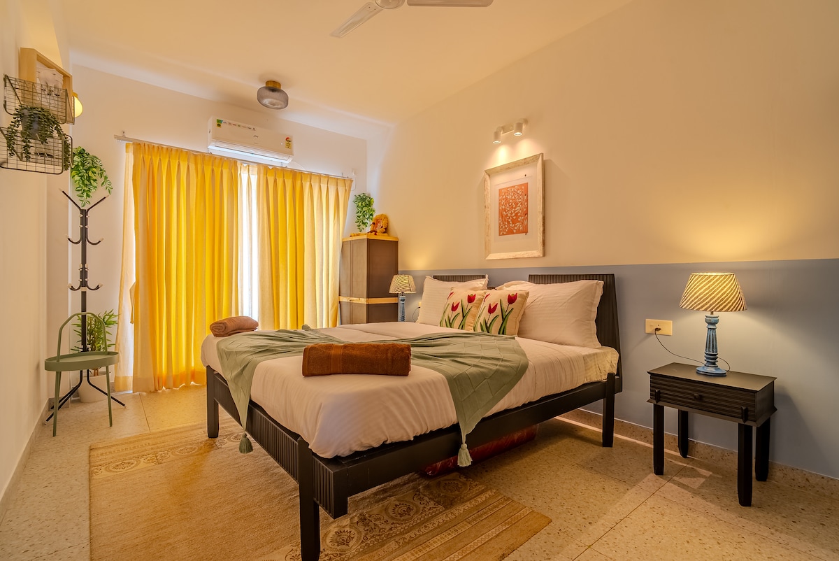 Independence, simplicity and modern luxuries in a 1BHK with hall, equipped kitchen, master bedroom with attached bathroom and a large private balcony. Sink into the 8-inch luxury king mattress, relax by the pool over snacks and drinks, or work comfortably with fast Wi-Fi while our team cares for the rest. Just 7 minutes by bike from Baga Beach, it’s your full Goan extravaganza on a smart, budget-friendly stay. Ideal for couples, remote workers or small families with comfort and homely freedom.