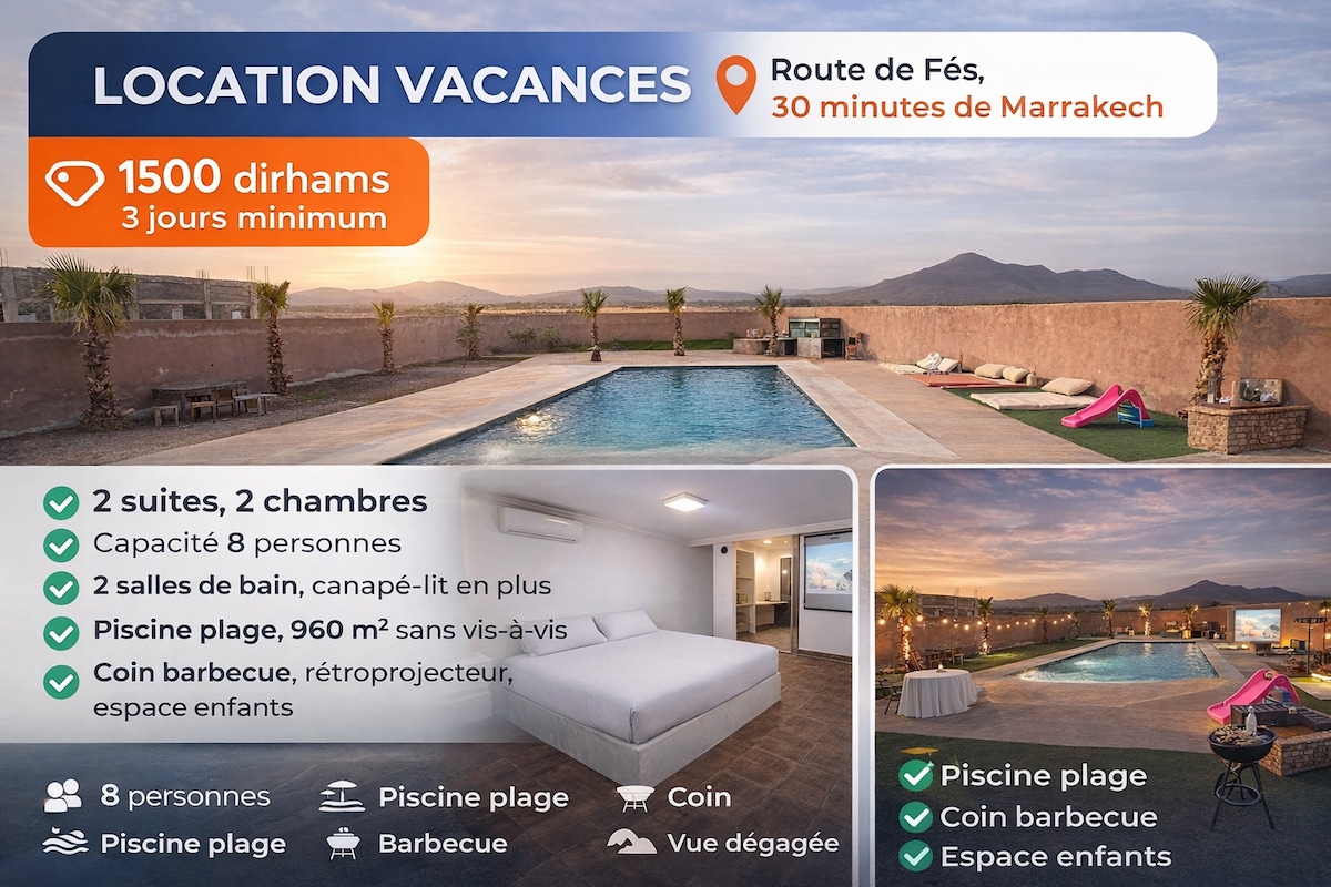 🏆 Nieuwe luxe villa in Marrakesh | Verwarmd zwembad • Uitzicht op Atlas • Golf Nieuwe luxe villa gelegen in Marrakech, Ourika weg, op 15 minuten van het centrum. Het heeft 4 elegante suites met kingsize bedden (200 x 200), een eigen verwarmd zwembad, aangelegde tuin, terrassen met barbecue en een prachtig uitzicht op het Atlasgebergte. Residentie met golf en 24-uursbeveiliging (3 stations). Huishoudster en kok inbegrepen. Ideaal voor gezinnen, vrienden of koppels.