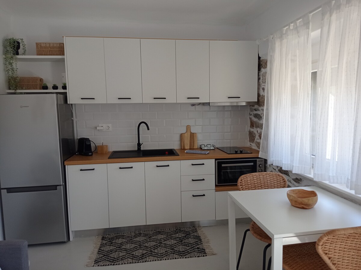 Volledig uitgerust appartement met één slaapkamer en frontaal uitzicht op zee. Een tweepersoonsbed in de slaapkamer en een slaapbank in de woonkamer, volledig uitgeruste keuken (oven, koelkast met vriesvak, vaatwasser, 4-pits), badkamer met douche , wasmachine, eigen terras met stoelen en tafel. Toegang tot een gedeelde patio met directe toegang tot de zee (rotsen) waar de gasten 's ochtends kunnen zwemmen. Uitzicht op zee vanuit de woonkamer en slaapkamer. Op een steenworp afstand van het centrum van Ermoupolis.