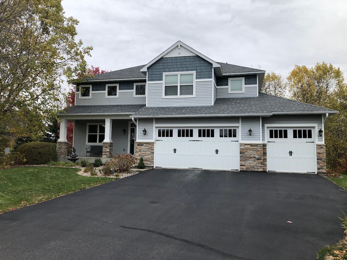 Hallo! We hebben een mooie plek die we 'stadsland' noemen. Ons huis ligt op 5 hectare met uitzicht op het meer vanaf een meertje(niet toegankelijk). Je zou de benedenverdieping van onze woning met twee verdiepingen boeken. Je ruimte is privé en is 2200 vierkante meter. Eigen ingang, off-road parkeerplaats. Geschikt voor maximaal 9+! Veel leuke attente extra 's! Afgeschermd in bubbelbad, patio, open haard, kitchenette, volledige fitnessruimte, speelkamer en meer! We liggen op 1/4 mijl van Coon Lake met varen en toegang tot het strand op een paar kilometer afstand. Op slechts 20 km van Mnpls.
