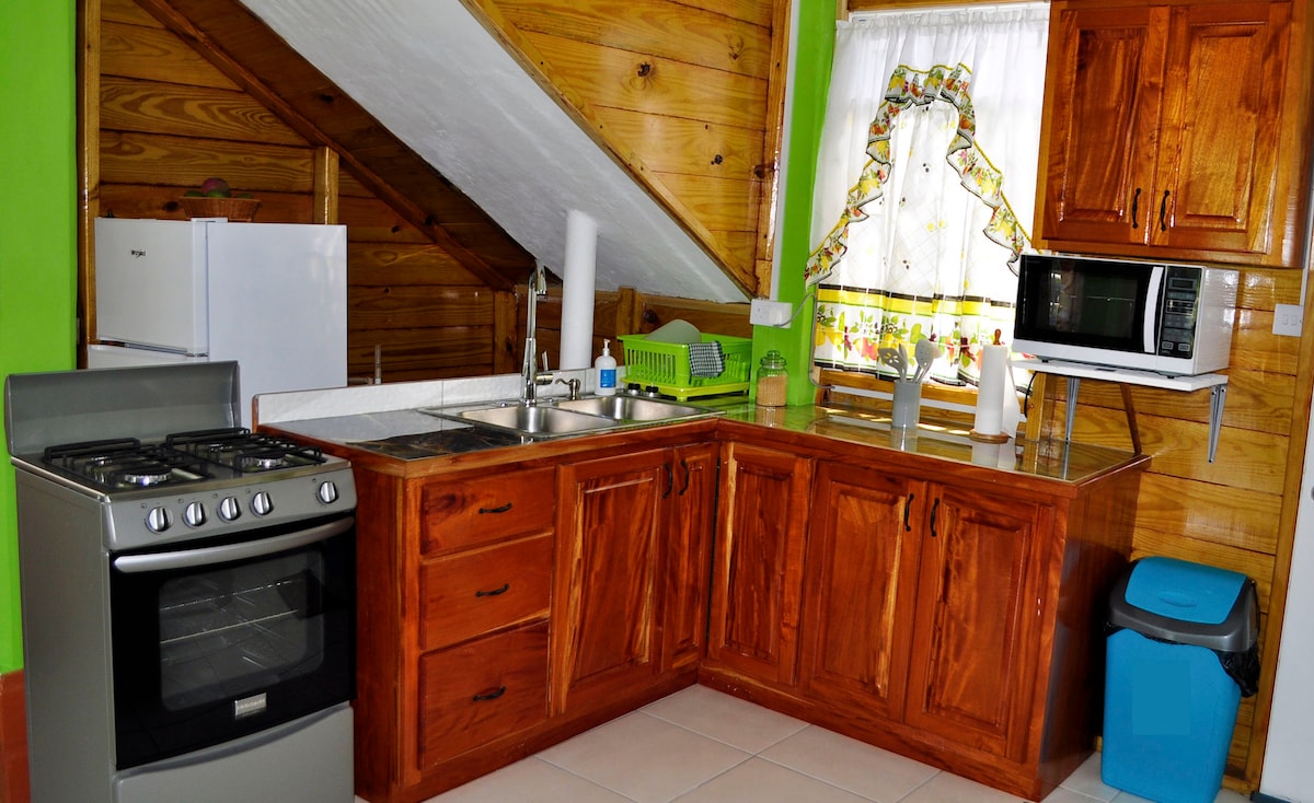 Ontsnap naar deze rustige studio, omgeven door weelderig groen en ontworpen met houten meubels. De ruimte is zorgvuldig ingericht voor comfort en biedt een gezellig slaapgedeelte en een functionele kitchenette. Gasten kunnen ook gebruikmaken van een verfrissend gedeeld zwembad. Perfect om af te koelen na een dag vol verkenning, of je hier nu bent voor een kort uitje of een langer verblijf, deze studio combineert natuur en comfort in één uitnodigende retraite. Deze studio ligt op 10-15 minuten rijden van stranden en watervallen in Soufriere
