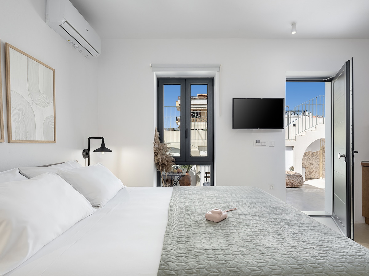 Dit appartement ligt in Chora, het belangrijkste dorp van het eiland, op een paar meter afstand van de meest schilderachtige restaurants en bars van het eiland, maar tegelijkertijd afgezonderd van het lawaai van het nachtleven. De slaapkamer is gelegen in een traditionele grotstijl (geen raam), terwijl de keuken en woonkamer veel natuurlijk licht hebben en (twee grote ramen en een glazen deur) uitzicht hebben op de zee en een bewoonde heuvel.