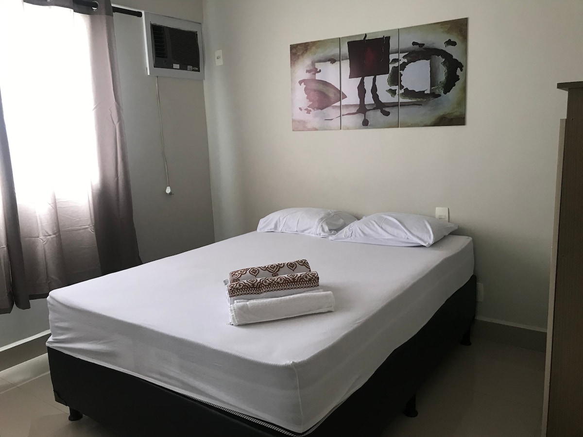 Uniek en gezellig appartement!!! Met 1 slaapkamer, 1 queensize bed, volledig ingericht, uitstekende locatie, met wifi, 2 smart-tv 's, apparaten zoals magnetron, koffiezetapparaat, filter met ijswater, strijkijzer, haardroger.. bed- en badlinnen en een eigen garage. Recreatiegebied compleet met verwarmd zwembad, sauna, jacuzzi, fitnessruimte, wasserette en in het winkelcentrum zijn er uitstekende restaurants en coffeeshops. Naast het beste winkelcentrum in Goiás, Flamboyant Shopping.