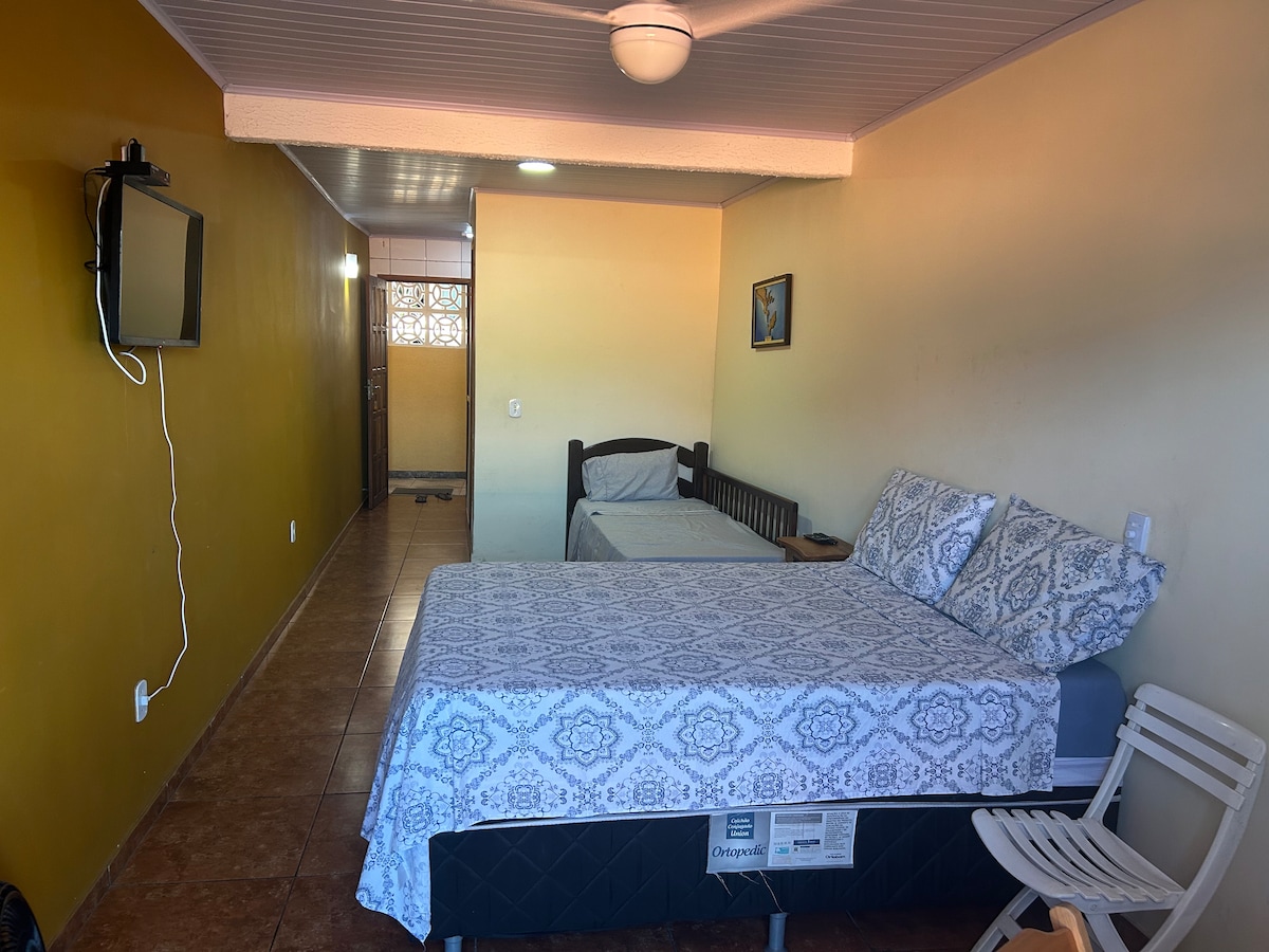 Flat com cozinha e banheiro privativos (só voces usam) com internet, TV 32'' , roupa de cama inclusa, localizado a duas quadras da praia, com ventilador de teto e ventilador de mesa 40 cm., Cooler que pode ser usado levando suas bebidas para praia, possui uma pequena varanda e rede de descanso, equipado com ferro elétrico, cafeteira, microondas e secador de cabelo Para acessar o Flat necessário subir uma alameda de uns 20 metros..
