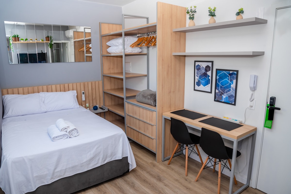 Wij hebben deze prachtige ruimte voor u gecreëerd voor een onvergetelijke ervaring in Curitiba. Gelegen aan de ingang van het Jardim Botânico park en dicht bij UFPR en FIEP. Geschikt voor maximaal 2 personen met voldoende comfort. Gezellige sfeer met: - warme/koude airco - geïntegreerde slaapkamer, woonkamer en keuken - KINGSIZE BED - SmartTV - WiFi. - strijkijzer/strijk - overlast - minibar - veilig - beddengoed, handdoeken, kussens en hoezen - PARKEERPLAATS op afgesloten terrein naast de studio