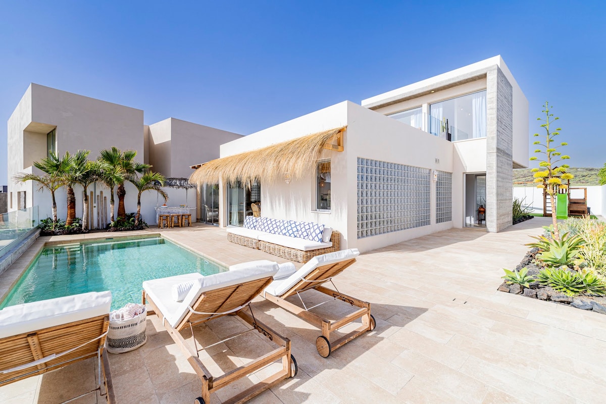 Beautiful modern house! 3 bedrooms, 3 bathrooms, one WC, very big terrace with private heated pool and gardens, magnificent views to the ocean. It is situated just in 7 min walking from the famous Siam Park and a new shopping center Siam Mall. The heating of the swimming pool is 150 euros per a week. We have outdoor camera for security. we´re responsible for ensuring that our listing is safe and compliant with safety regulations.