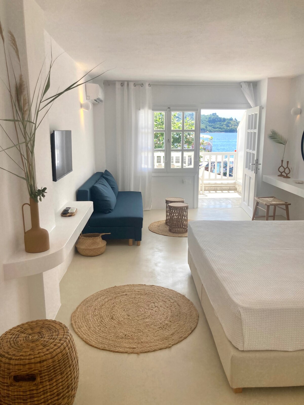 Modern Studio with Nice Port Views in Skiathos Town Experience the charm of Skiathos from this brand-new, modern studio situated right on the port. Enjoy views of the marina, boats, and people passing by. Inside, you'll find a comfortable double bed, a modern bathroom, a small kitchenette and a cozy living area equipped with a flat-screen TV and Wi-Fi. Ideal for couples or solo travelers seeking comfort and convenience in the heart of Skiathos.