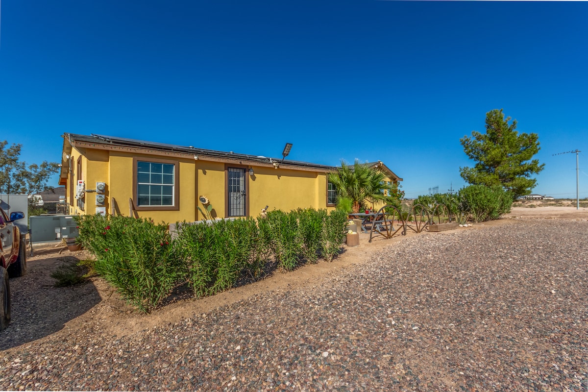 Relax with the whole family at this peaceful place to stay. Located in Buckeye AZ only 35 minutes from Phoenix. 2 bedroom 2 bath with pull out couch comfortably sleeps 6. Lots of hiking nearby, lakes and shopping. Enjoy our stock tank pool (seasonally), bbq area, putting green and fire pit. At night the string lights provide ample light for night time activities. Close to Phoenix raceway, spring training and Cardinals stadium.