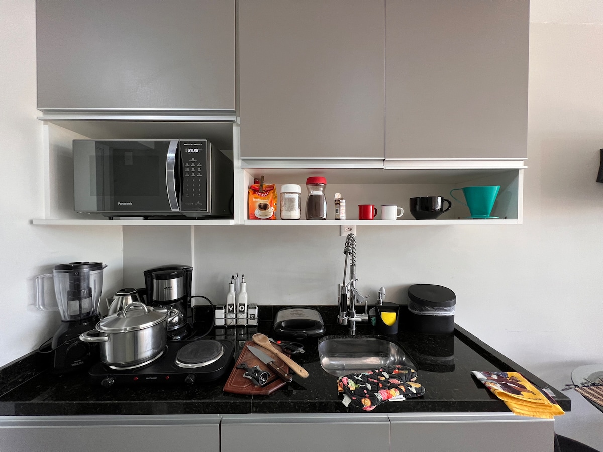 ✨ Je hebt het comfort van de 16e verdieping in deze loft met Alexa Automation, SmartTV, elektrische open haard, Ar-Split en keuken uitgerust, gasdouche, Simmons-bed ('s werelds meest comfortabele) en gratis garageplek inbegrepen! Hier vind je: • Dakterras met panoramisch uitzicht • Barbecueiras • zwembad van 25 m • Academia • Space Coworking • 24 uur per dag toegangspoort • Wasserij • Lift, garage Proximidades: • Supermarkten • Luchthaven ⟶ 25 min (auto) • PUC⟶ 4 min (te voet) • Centro, consulaat⟶ 15 minuten (auto)