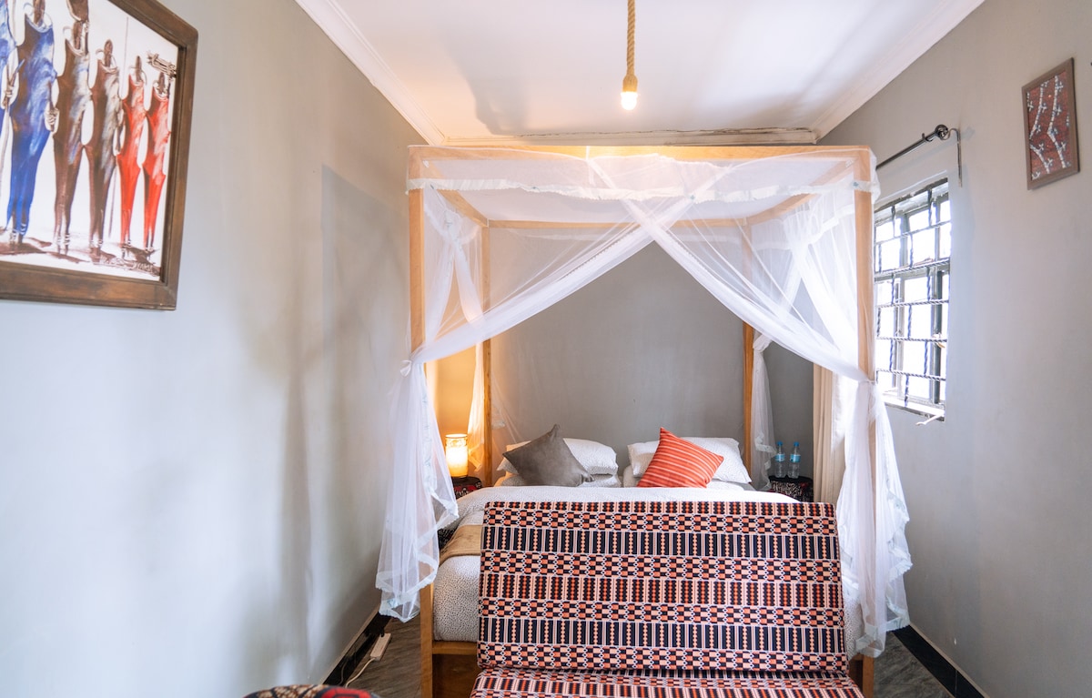 Dit is een boskamer die verbonden is met ons prachtige huis in Arusha. We wonen op een 50 hectare groot, privé, familiecomplex waar je kunt wandelen/hardlopen en genieten in deze beveiligde ruimte. Om ons heen ligt Olasiti Village, op 9 minuten van de luchthaven Arusha. De kamer is ruim met een eigen ingang, en-suite douche en groot bad voor twee! Of je nu gewoon wilt ontspannen na je werk of een stel dat op zoek is naar een privé-uitje, deze ruimte is perfect voor jou!